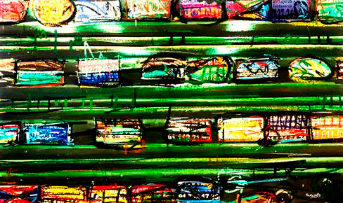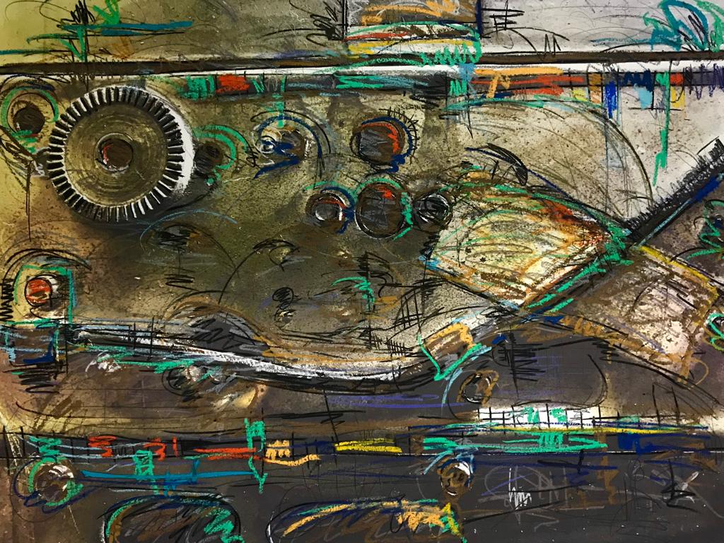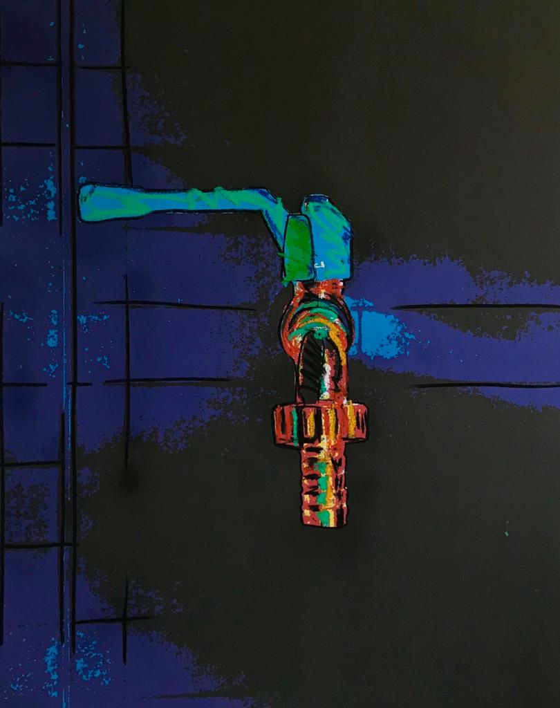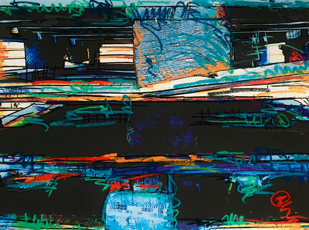 DISPONIBLE, impresión sobre canvas, óleo pastel y carboncillo, 134 x 97 cm